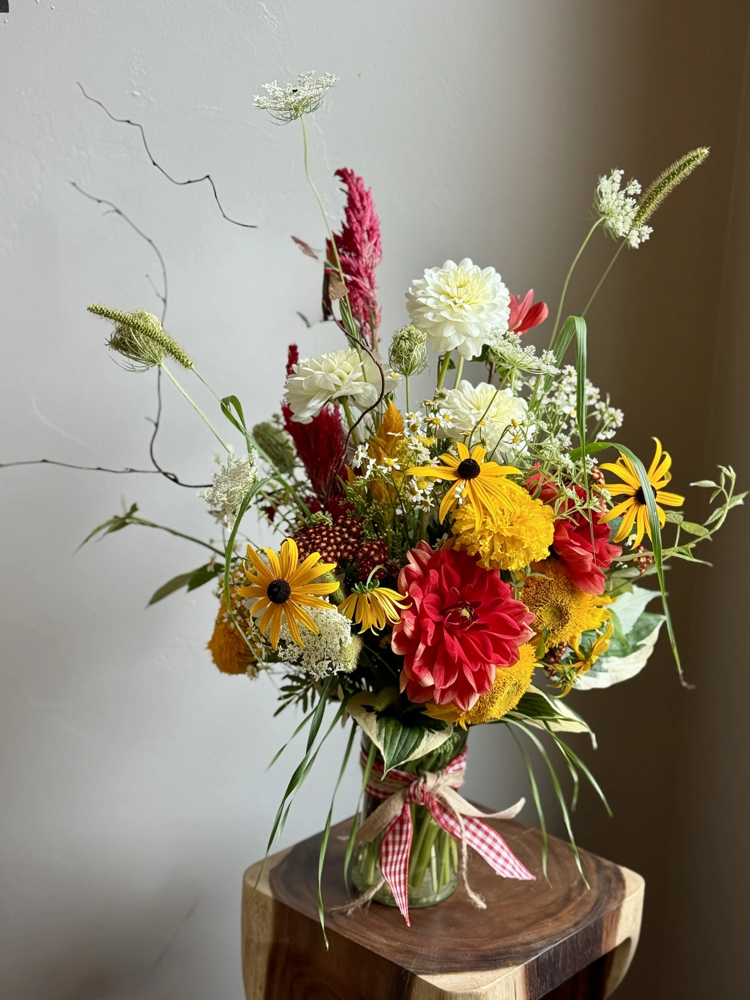 Made especially for you, seasonal flowers, grasses and ornamental stems, to bring you JOY. Choose your price range ($60-$200). Farm flowers are available May thru September, supplemented with wholesale flowers in the off season. Wholesale flower additions require 24 hour preorder time.